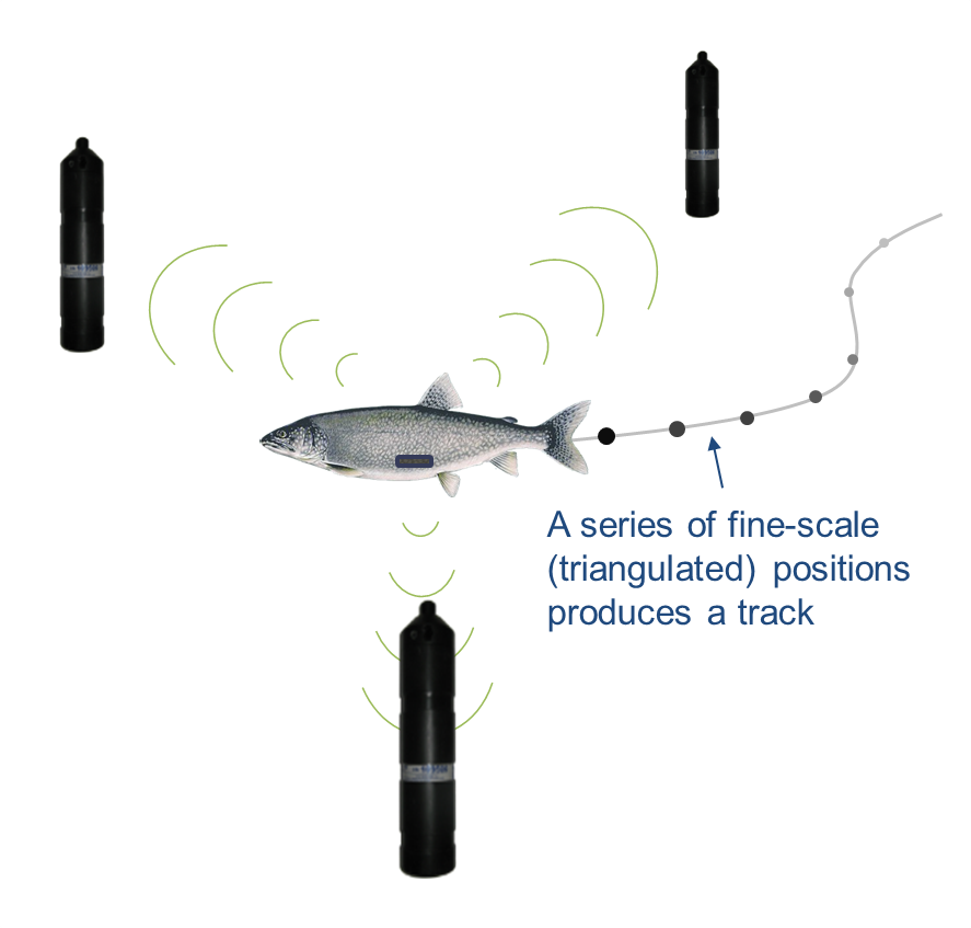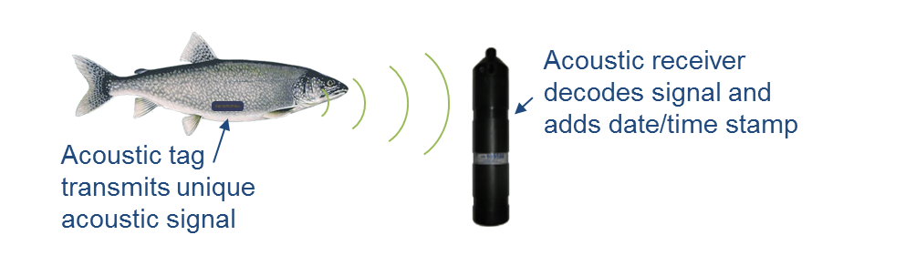 Researchers use acoustic telemetry to collect information about fish movements (e.g., migration patterns, habitat use, survival). An acoustic telemetry system consists of two main components: transmitters and receivers.