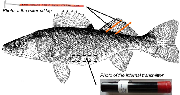 Internal tags are electronic transmitters and may contain important data with a if returned. Please DO NOT FREEZE and handle with care! If you haven't done so already, immediately remove the internal transmitters from the fish and rinse with water. Store the transmitter at room temperature. Contact the Hammond Bay Biological Station at 989-734-4768 for how to return the tag. You may keep the fish!